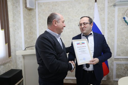 Затем Аскандар Магомедов вручил Благодарственное письмо Министерства образования и науки РД коллективу Управления образования города за плодотворную работу в период проведения ЕГЭ в 2020 году, а почетной грамотой министерства был отмечен главный специалист ГУО Али Байтемиров.