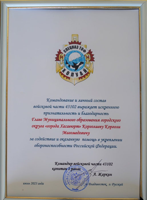 На имя Главы г. Хасавюрт Корголи Корголиева поступило благодарственное письмо от командования и личного состава войсковой части 43102, в котором выражается признательность за содействие и оказанную помощь в укреплении обороноспособности Российской Федерации.