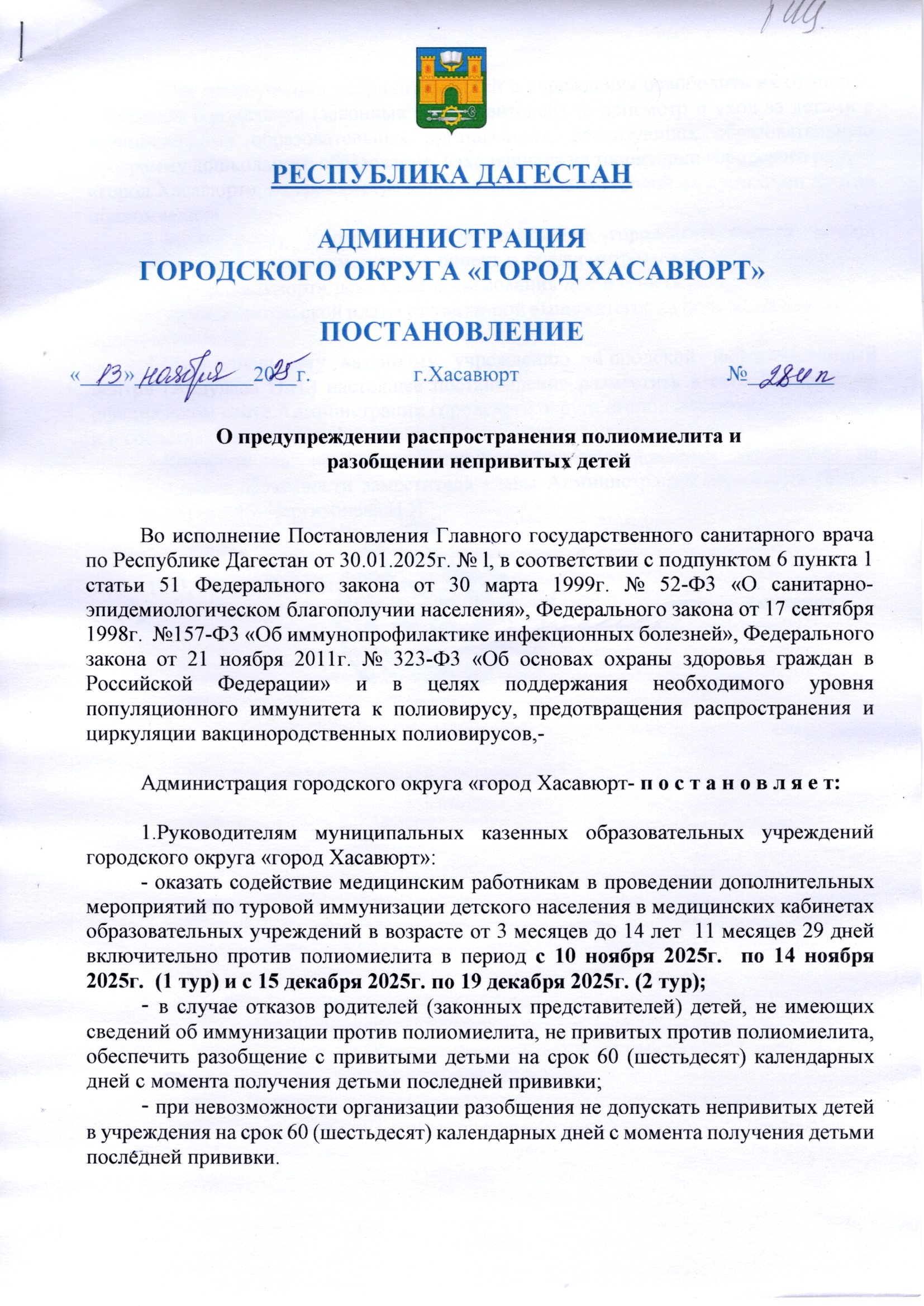 Постановление от 13 ноября 2025 г. № 284 п О предупреждении распространения полиомиелита и разобщении непривитых детей